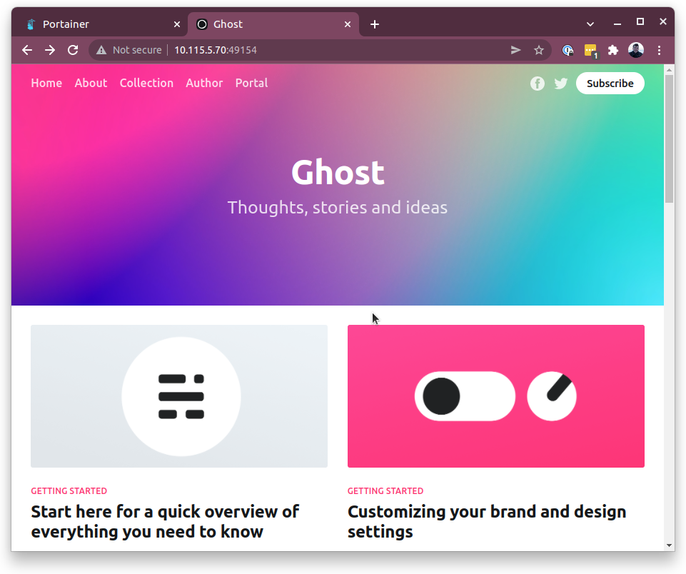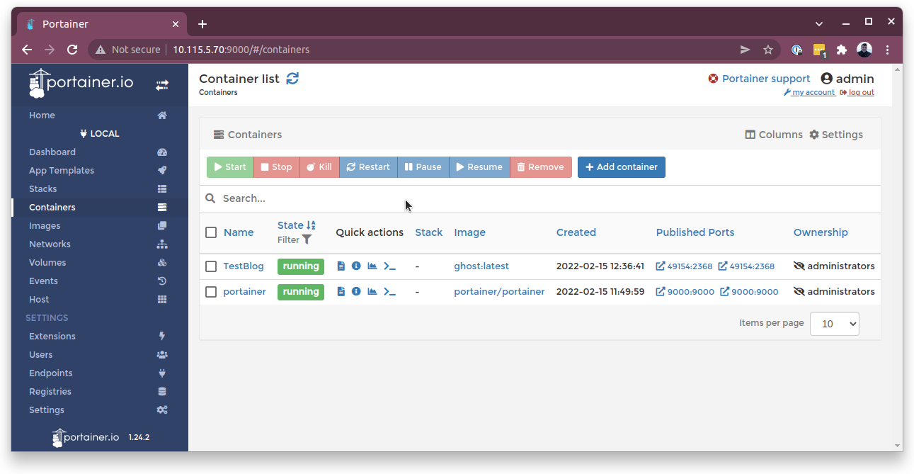 On the Containers page, you should now see two containers running. One containing Ghost, and the other containing Portainer itself.