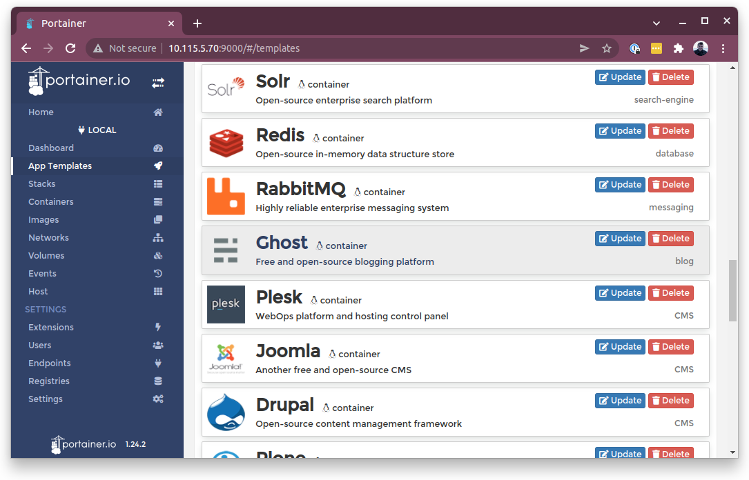 For this tutorial, you will be creating a blog using the Ghost template in Portainer. Portainer has many other app templates if you are looking for more ideas. If you want more selection, you can launch containers from the Docker hub from Portainer or from the command line.