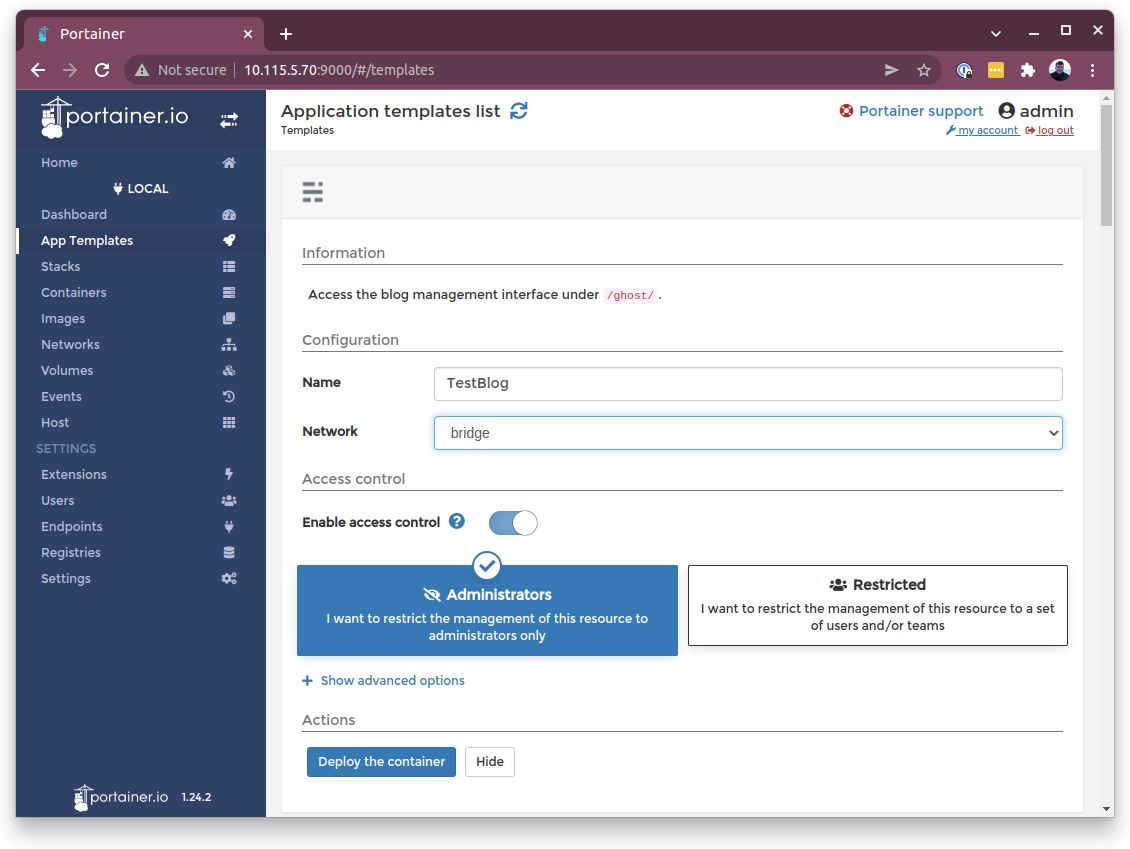 Inside Portainer, click on App Templates in the left toolbar, and scroll down to the Ghost template.