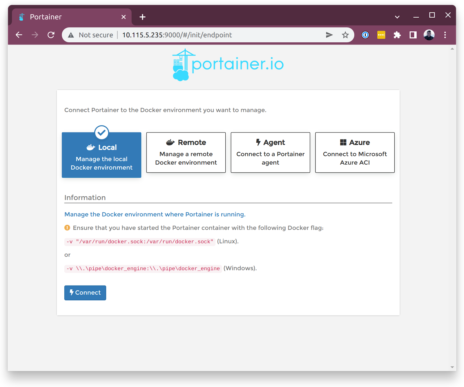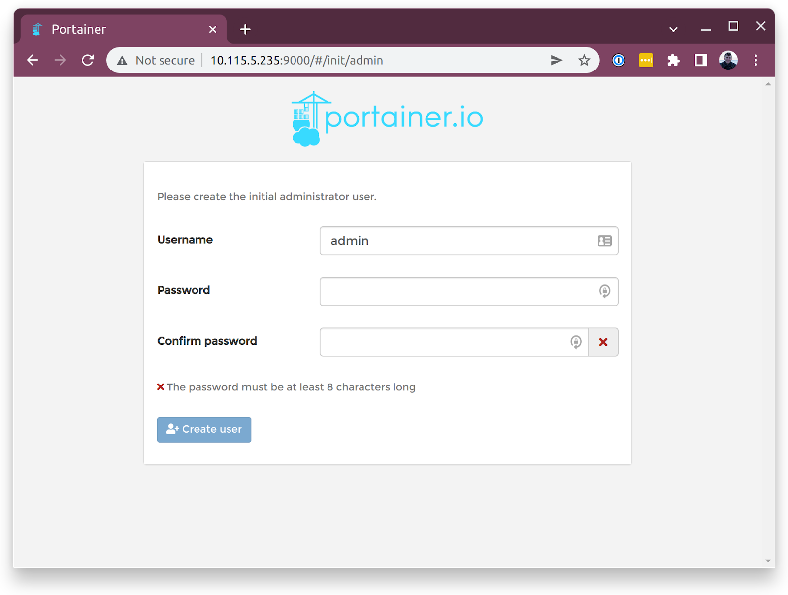 Copy the IP address starting with “10” and paste it into your browser, then add a colon and the Portainer default port, 9000. It should look like this: 10.115.5.235:9000. This will take you to the Portainer login page where you can set a username and password.