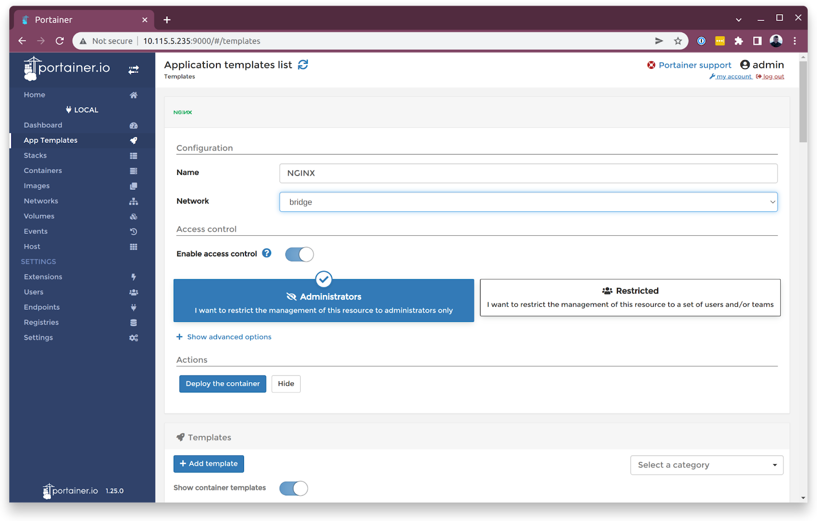 Inside the newly selected local Docker environment, locate the sidebar menu on the page and click on App Templates, then select NGINX.